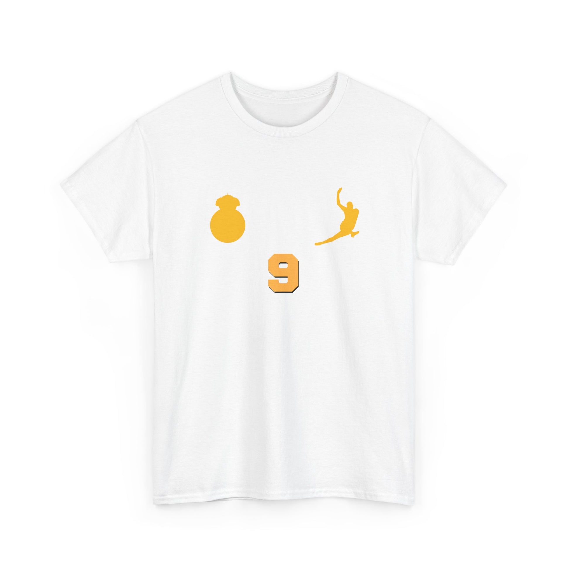 A soft, breathable cotton tee that wears like an easy, lived-in favorite. The shirt features small, sunlit-gold graphics placed across the chest and sleeves — a playful silhouette, a simple number, and a round emblem — for a low-key sporty vibe. It sits with a relaxed, classic fit and a crew neckline, so it layers cleanly under jackets or stands on its own with jeans. Built thoughtful: shoulder taping for stability, a ribbed collar that keeps its shape, and a tear-away label for scratch-free comfort. Ethically grown cotton and Oeko-Tex certification mean you can wear it with quiet confidence.